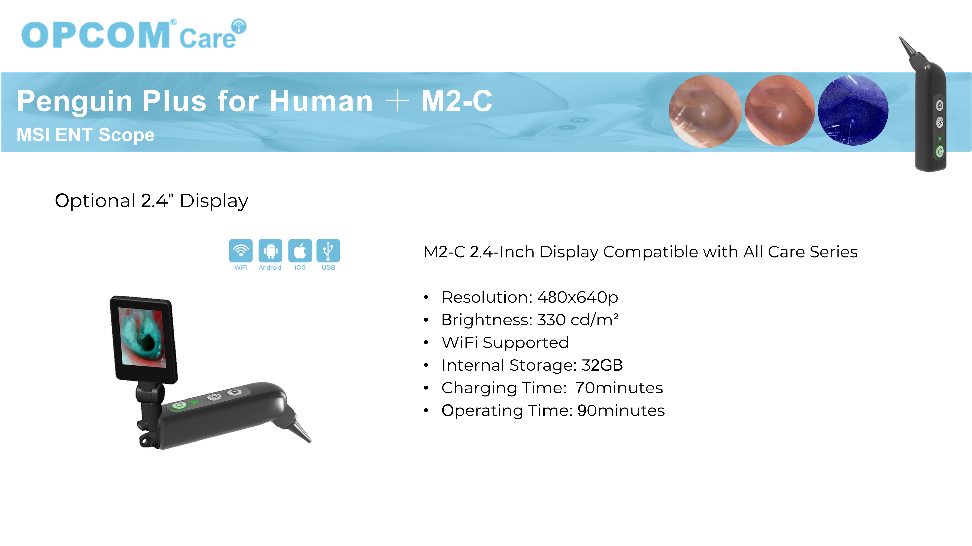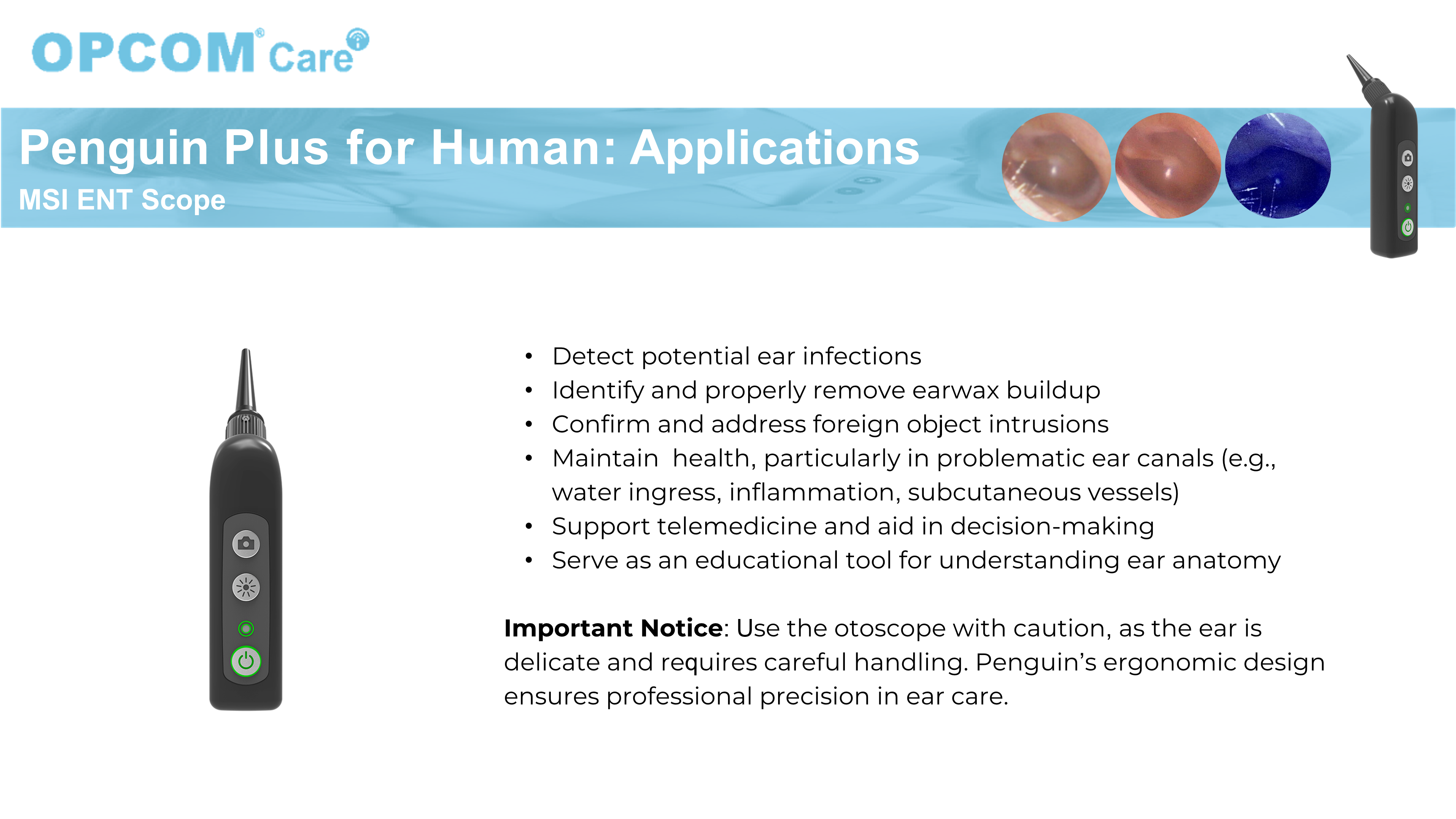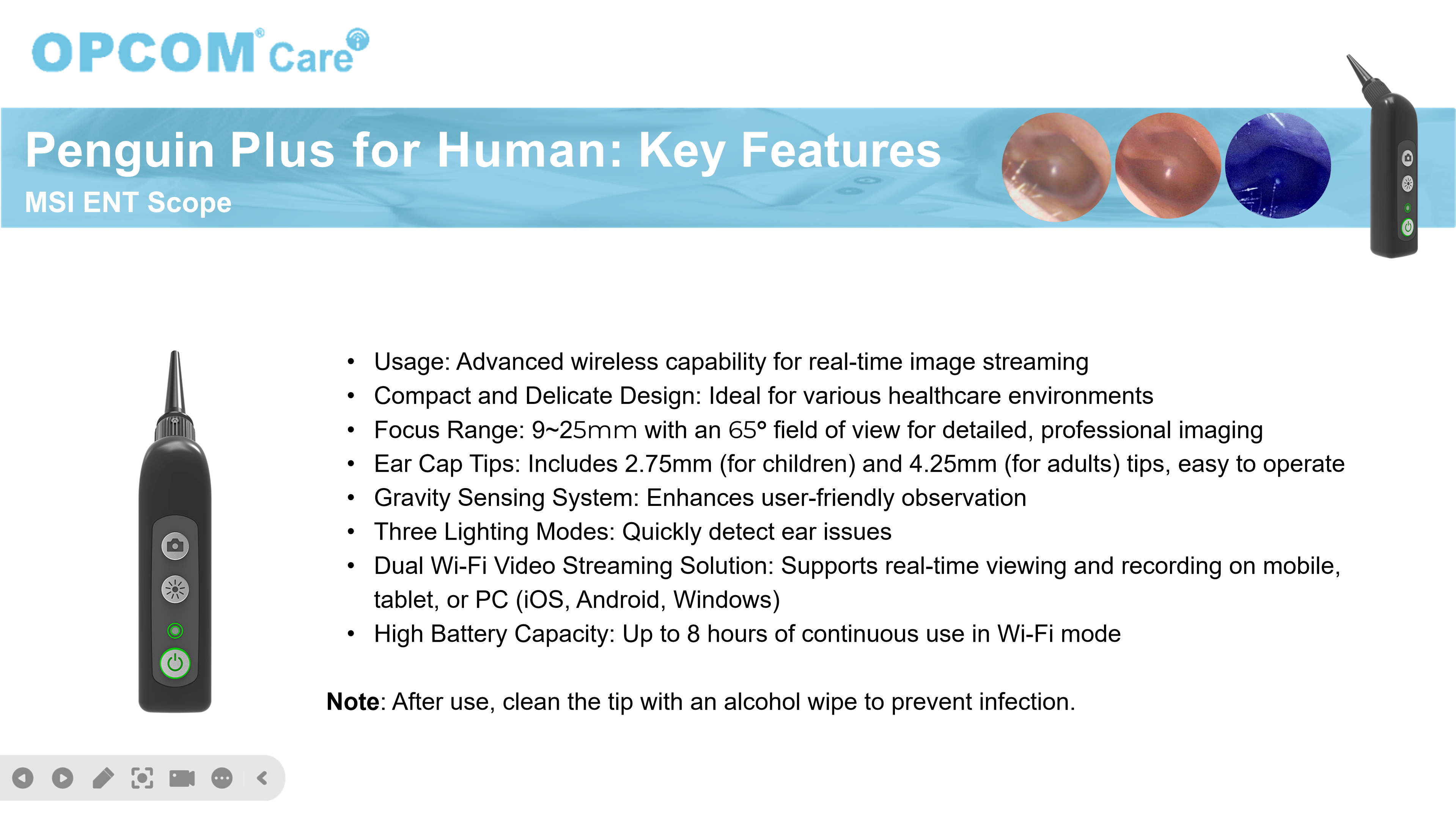 The Penguin Plus for Vet is designed for pet ear health, featuring advanced wireless technology for real-time video streaming. Its compact and refined design is suitable for various pet care environments, offering a 9-25mm focus range and an 65° field of view, along with 4.2mm and 6.0mm ear tip attachments. The gravity sensing system and three lighting modes aid in the quick identification of ear issues. A 2.4-inch display and Wi-Fi dual-video streaming solution support simultaneous viewing on multiple devices, with up to 8 hours of continuous use in Wi-Fi mode.