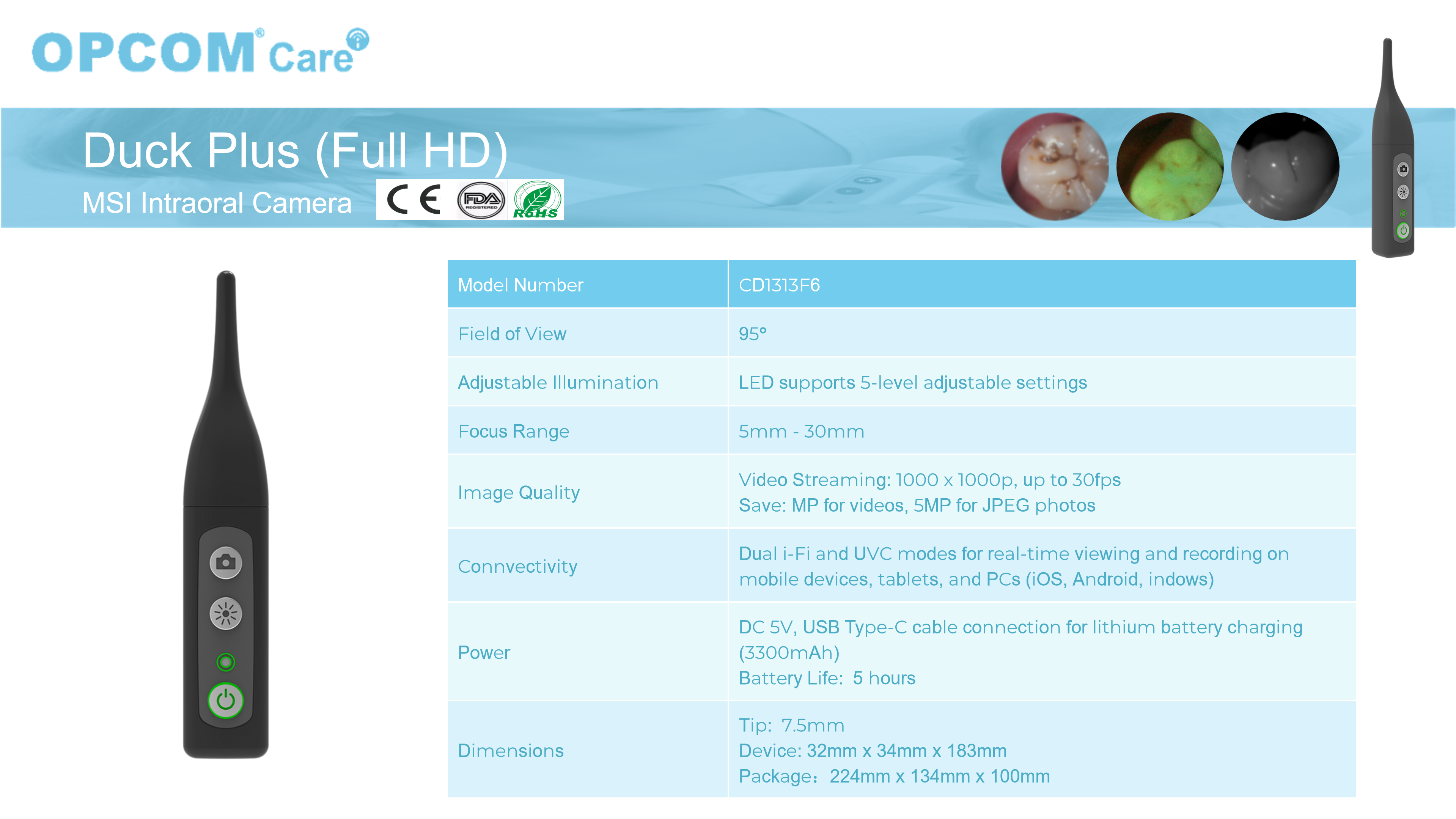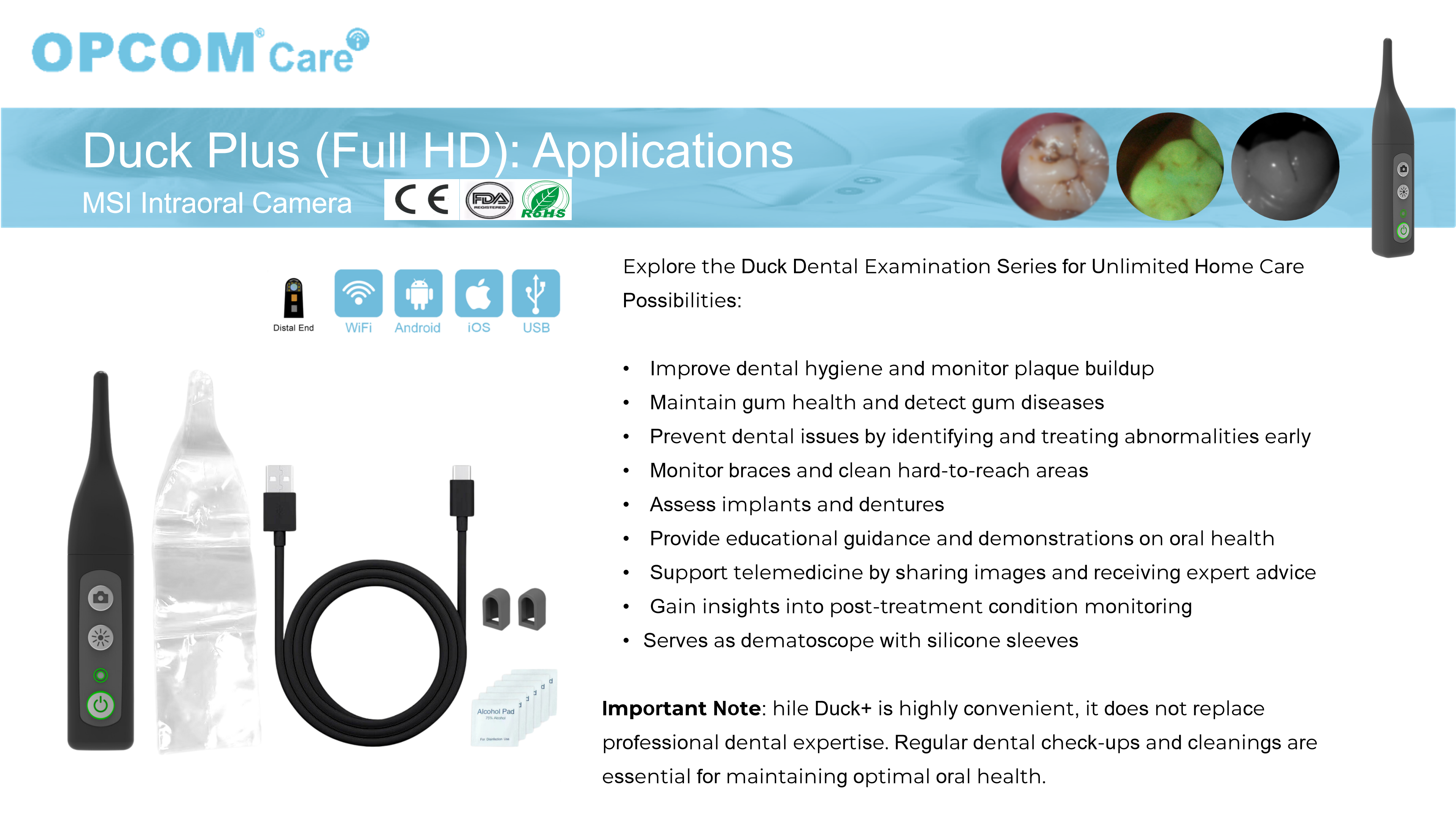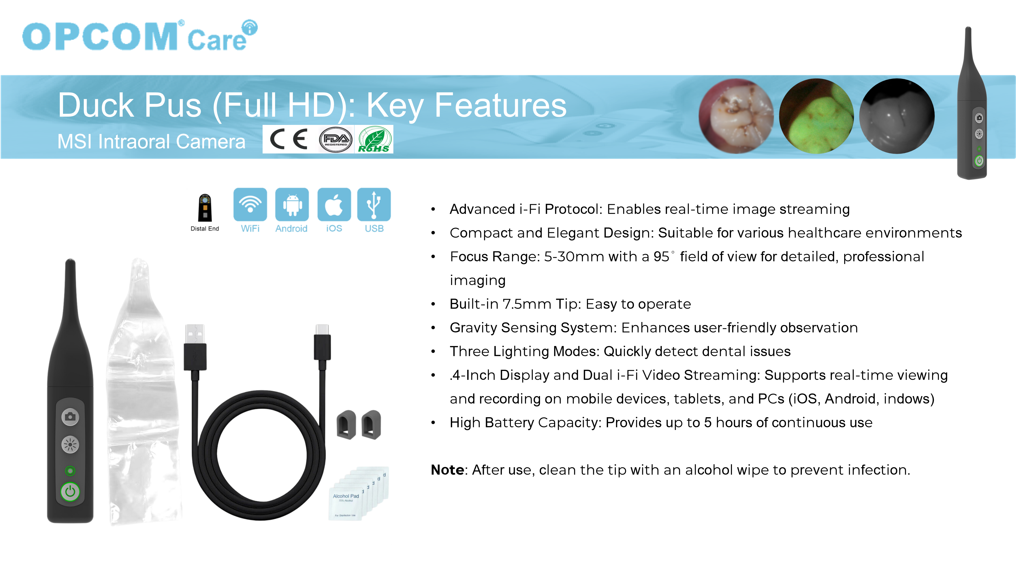 The Duck Dental Inspection Series is designed specifically for home care, featuring advanced Wi-Fi technology for real-time video streaming. Its compact and refined design is suitable for various environments, offering a 5-30mm focus range and a 95° field of view, with a built-in 6.0mm tip. The gravity sensing system and three lighting modes assist in quickly identifying issues. The 2.4-inch display and Wi-Fi dual-video streaming support real-time viewing on multiple devices, with a battery life of 5.5 hours.