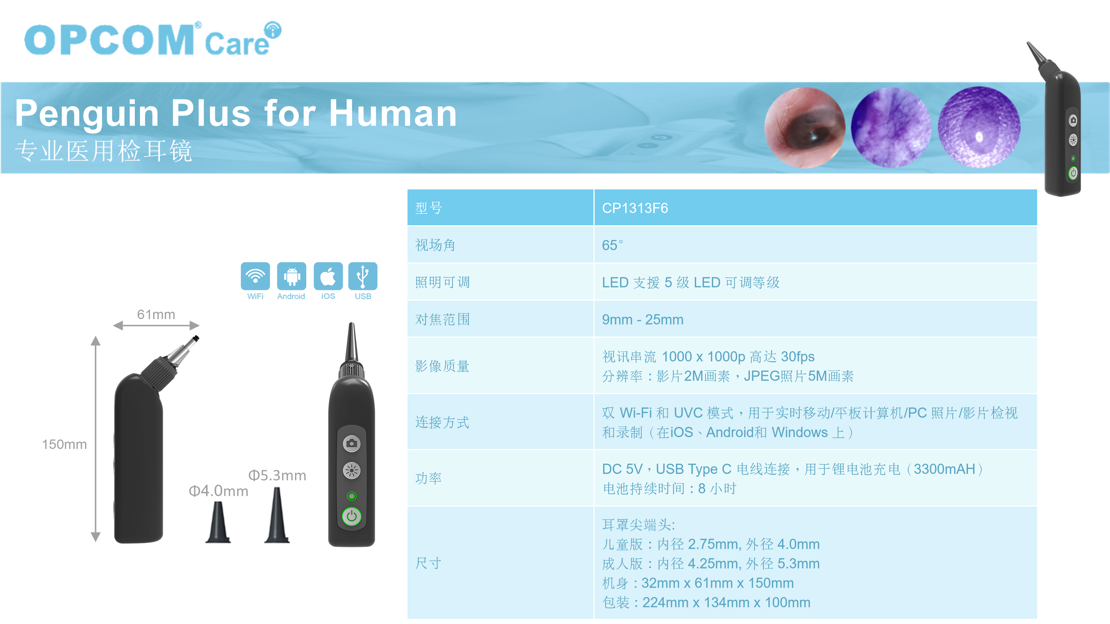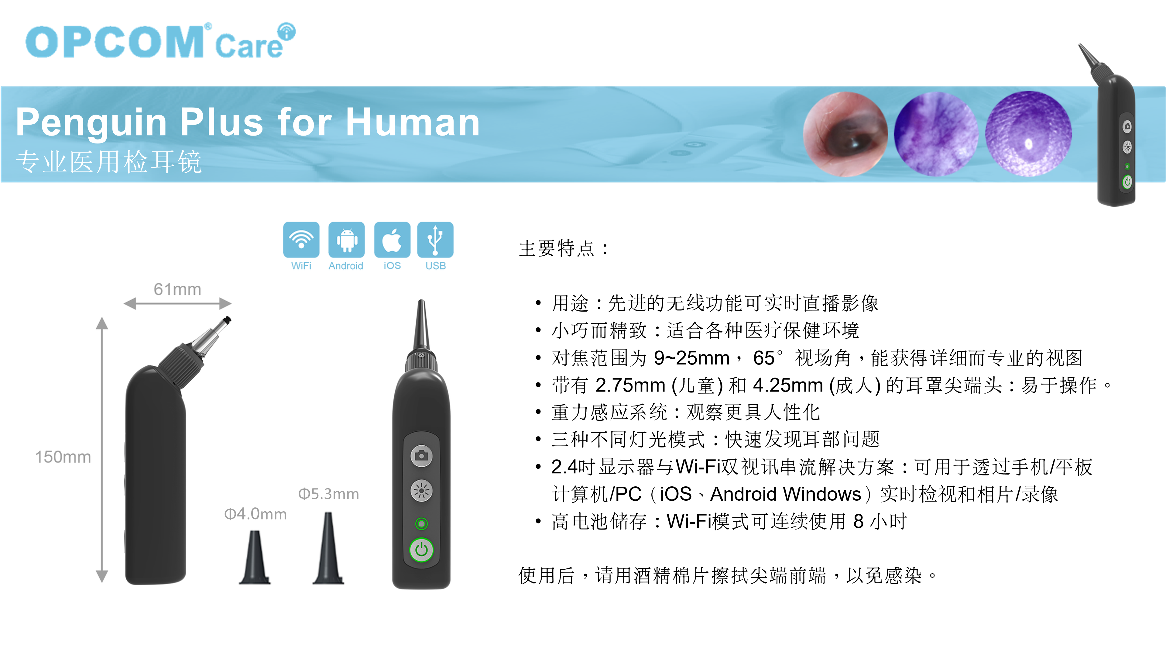 内窥镜等级耳镜,内建三种多光谱照明模式,及时发现耳部感染、耳垢堆积及异物侵入。解析度加强30%,支援更高解析度的视图,大大提升远距诊疗品质。内置高电池储存,连续使用时间达6小时以上,适合各种医疗环境。