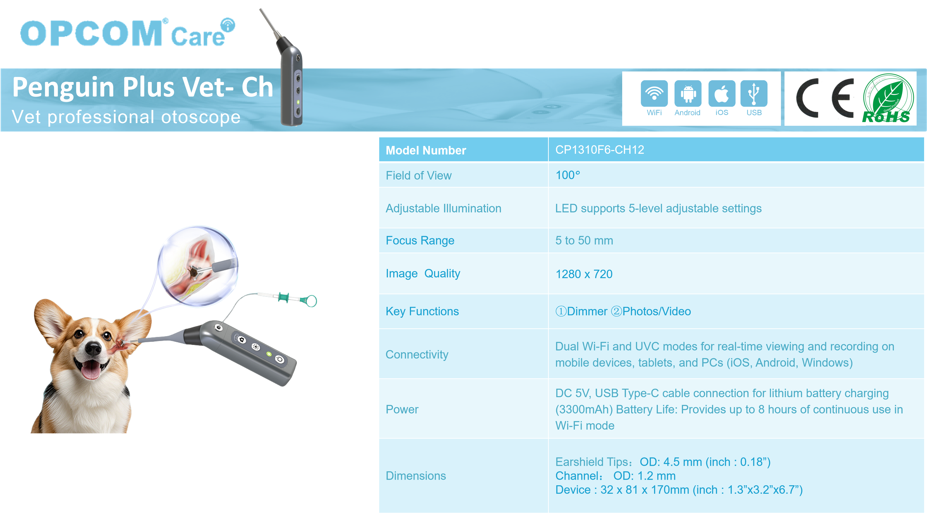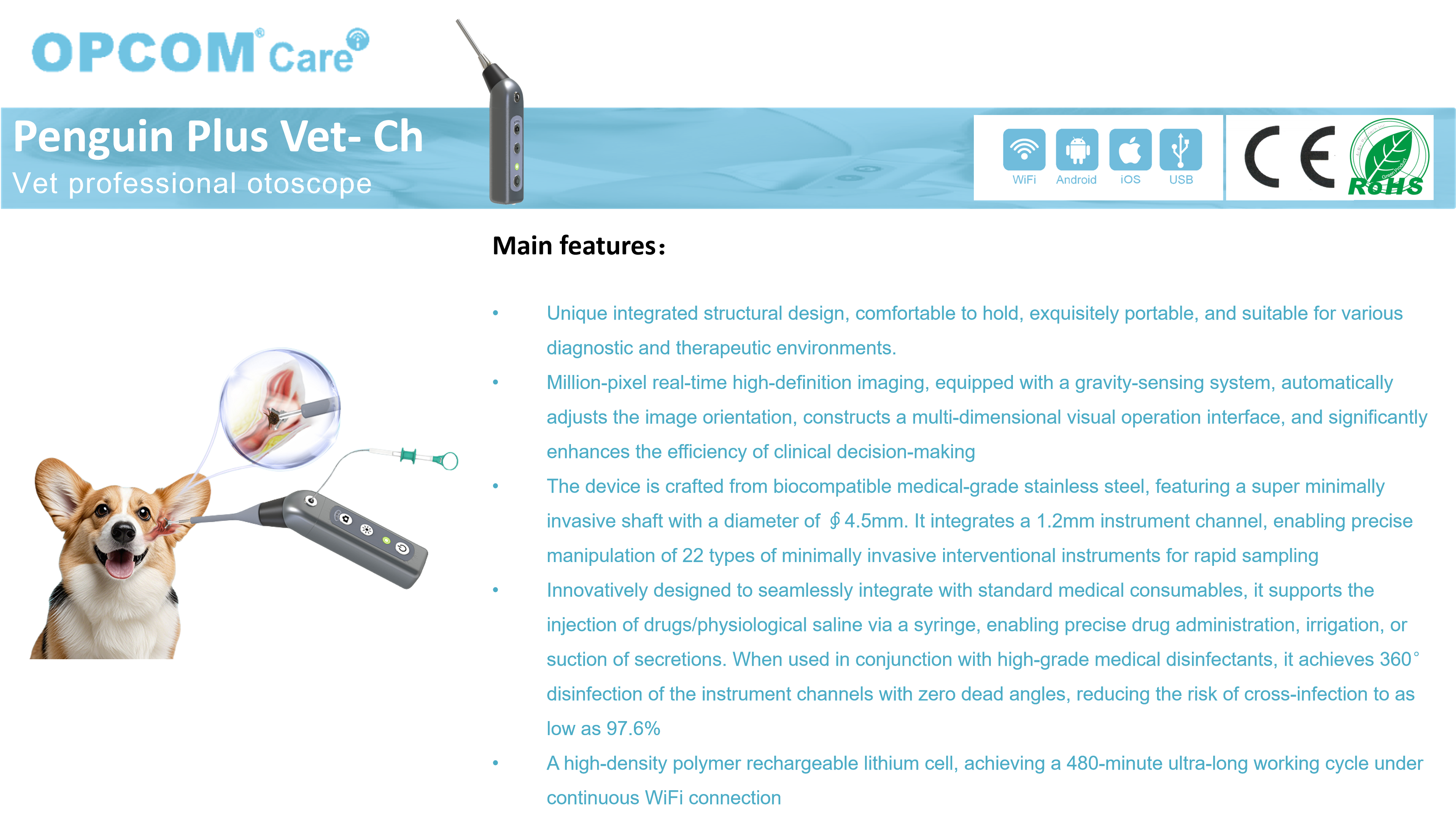 Specially designed for ear examination of cats and dogs, using biocompatible medical stainless steel to create a Φ 4.5 ultra minimally invasive diameter mirror, integrating a 1.2mm instrument channel, supporting foreign body forceps, biopsy forceps, and rapid sample collection. Chuangxing Construction can seamlessly integrate standard medical consumables, supporting the use of syringes to inject drugs/physiological saline, precise administration, flushing, and combined with medical disinfectants to achieve 360 ° zero dead angle disinfection of instrument channels, reducing the risk of cross infection to 97.6%. Built in high battery storage, with a continuous usage time of over 8 hours, suitable for various medical environments.Purchase Now: