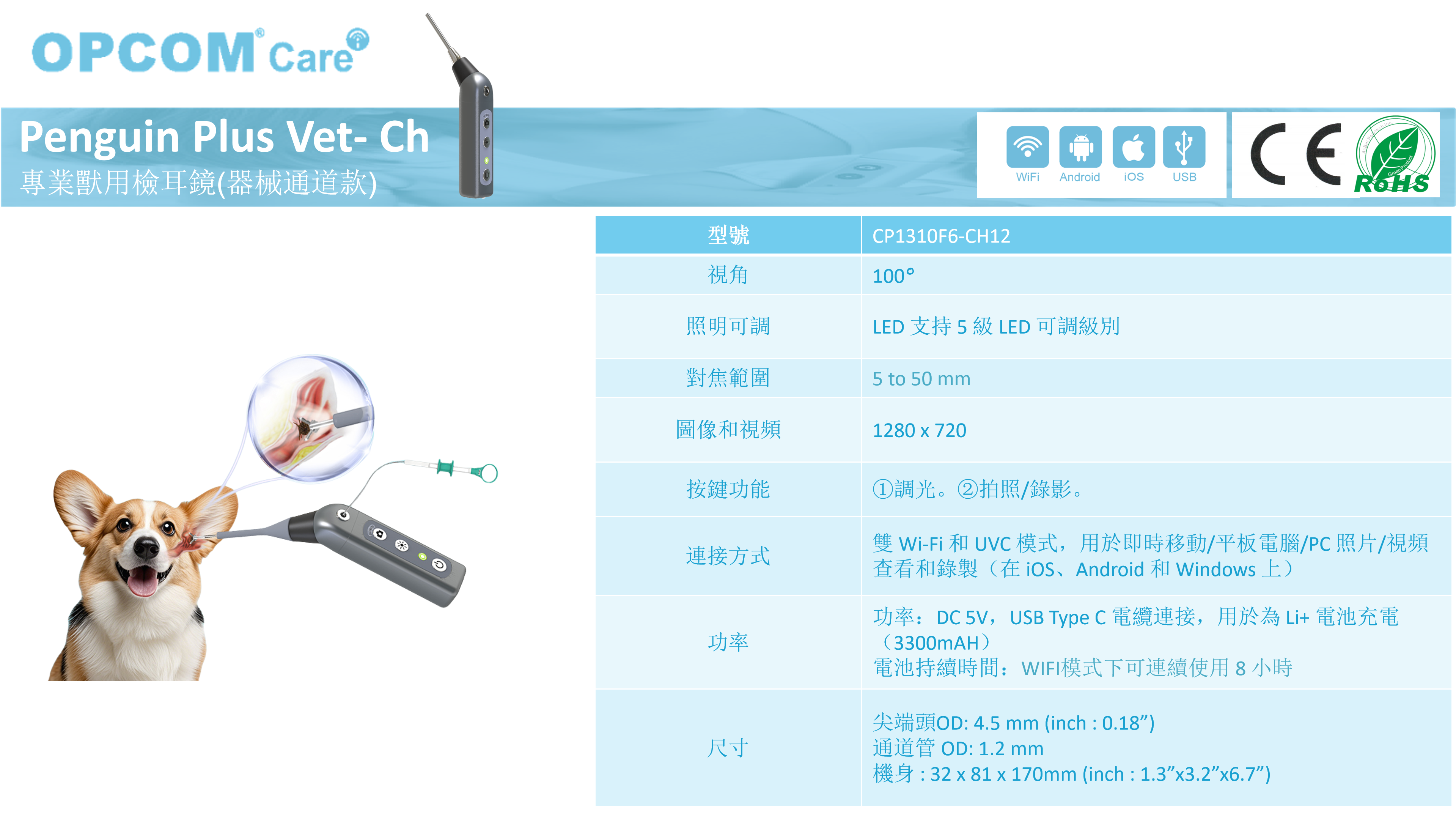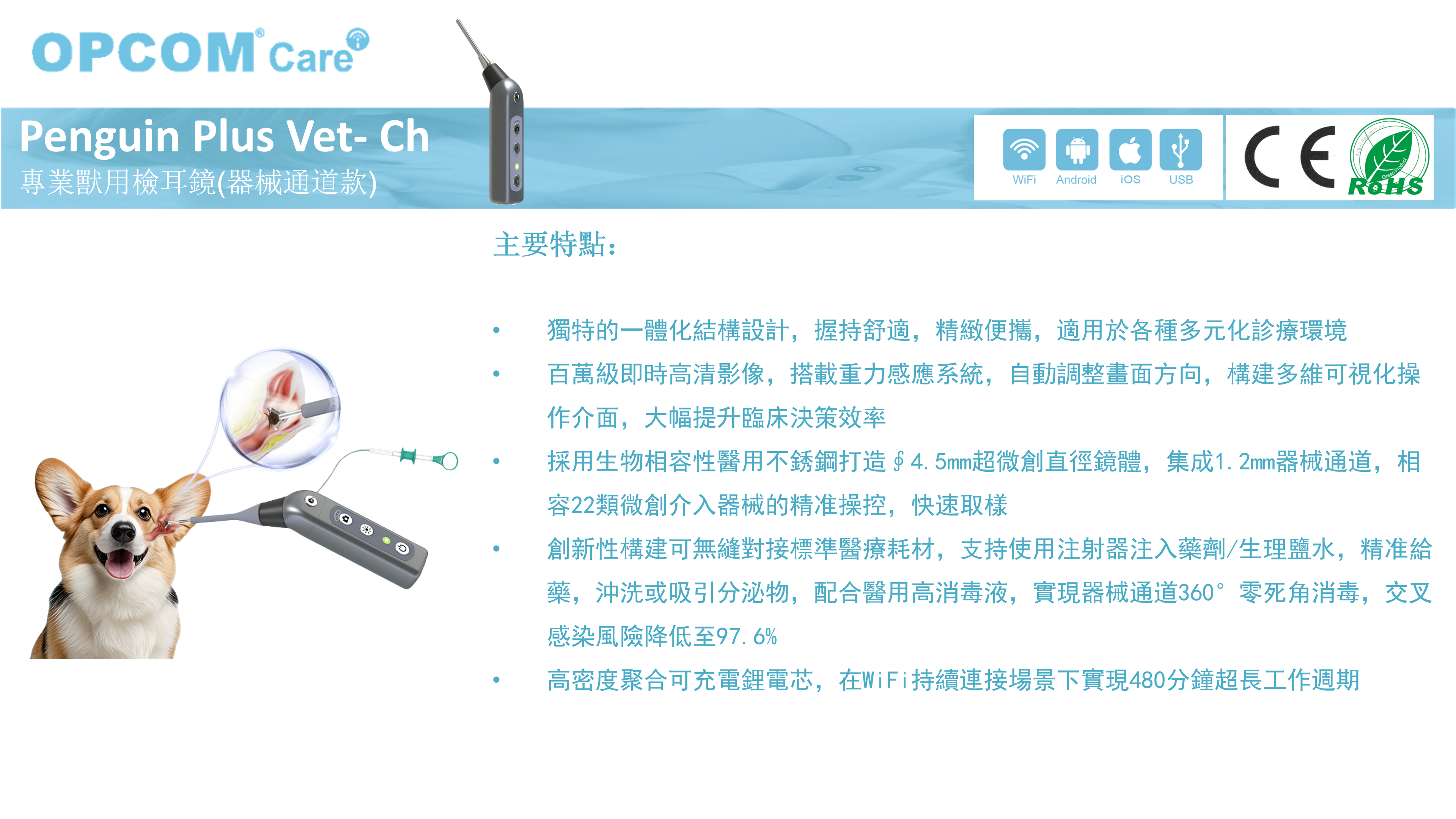 守护寵物耳部健康 專為猫狗耳部檢查設計,採用生物兼容性醫用不鏽鋼打造∮4.5超微創直徑鏡體,集成1.2mm器械通道,支持異物鉗,活檢鉗,快速採集樣本。創興性構建可無縫對接標準醫療耗材,支持使用注射器注入藥劑/生理鹽水,精準給藥,沖洗,配合醫用消毒液,實現器械通道360°零死角消毒,交叉感染風險降低至97.6%。內置高電池儲存,連續使用時間達8小時以上,適合各種醫療環境。 購買連結: